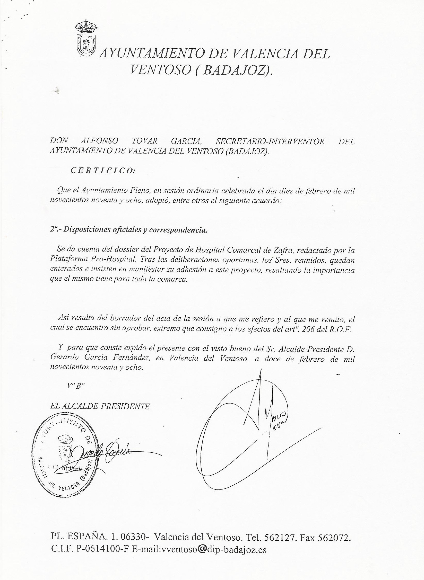 Documento del Ayuntamiento de Valencia del Ventoso al Proyecto del Hospital. Año 1998