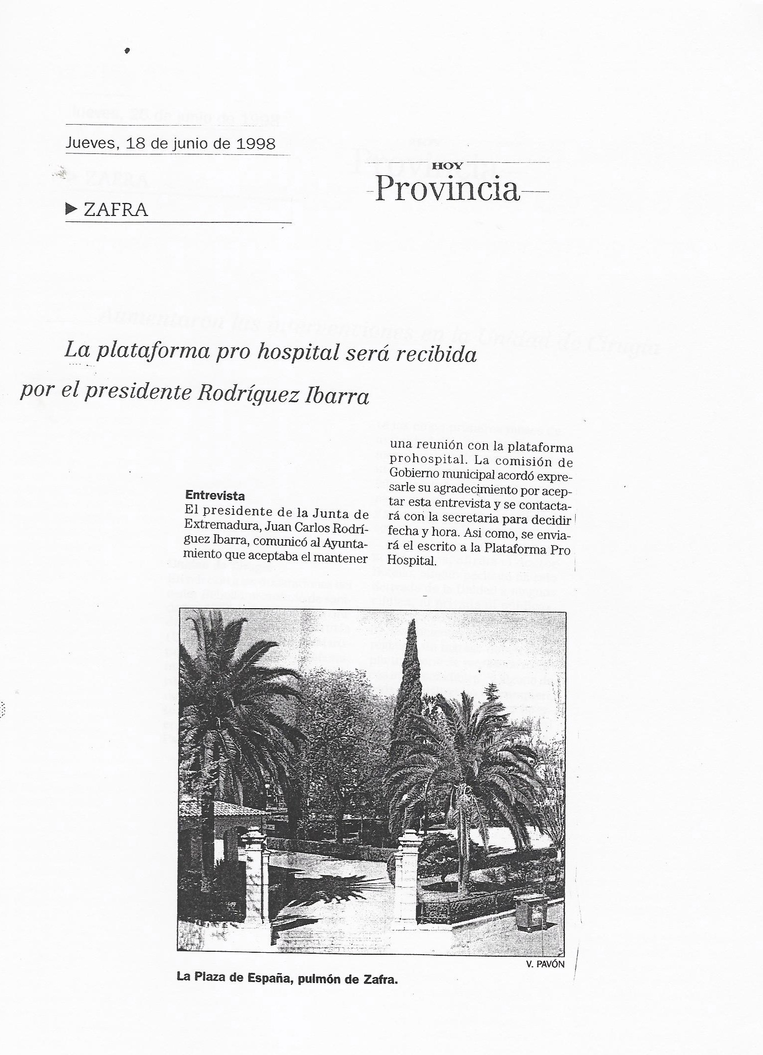 El proyecto del Hospital de Zafra fue apoyado por muchos sectores de la población en el Año 1998, lo cual fue muy importante para darle importancia y fuerza a los argumentos y poderlo enregar en las distintas administraciones para conseguir el Hospital para Zafra.