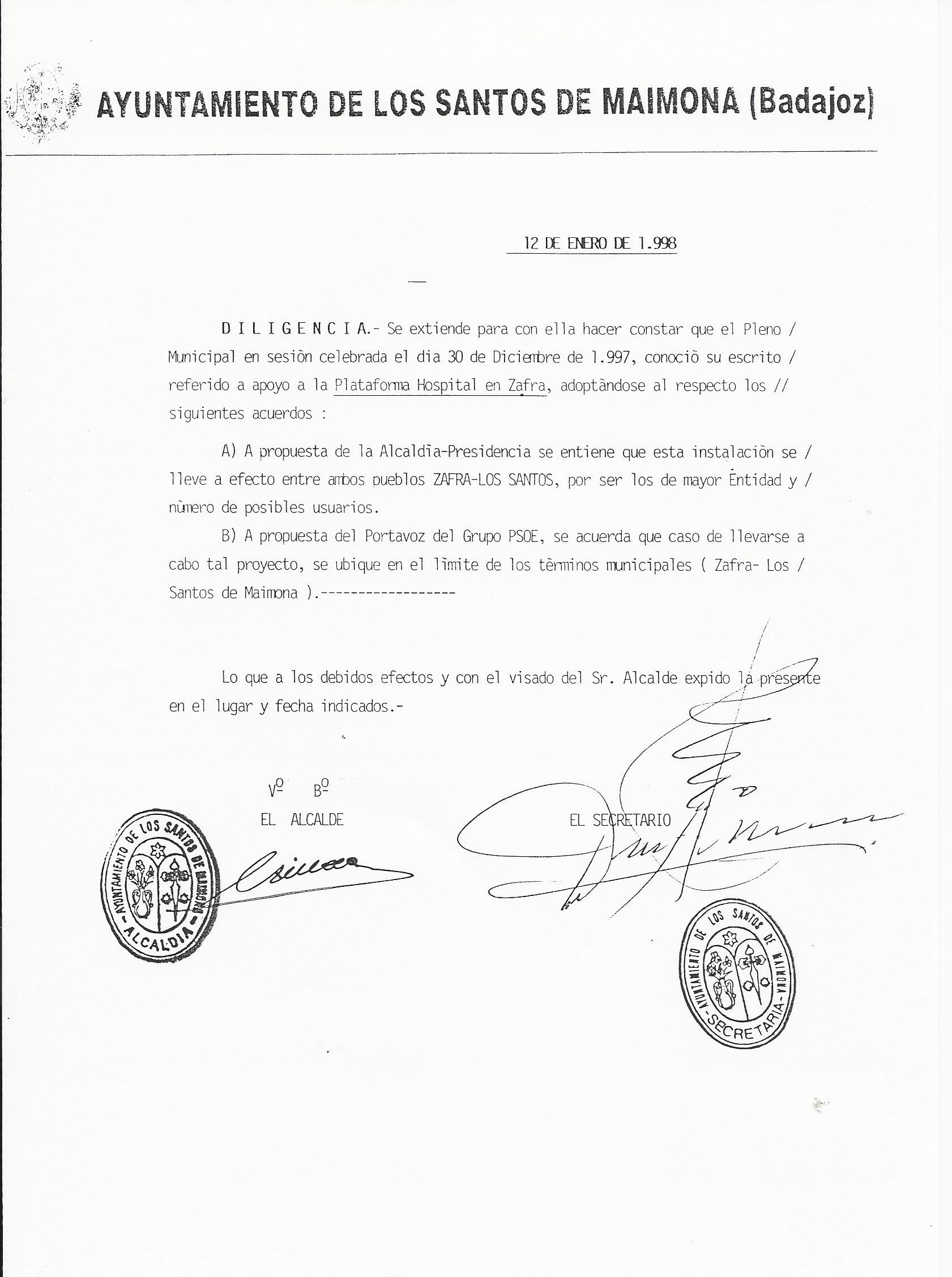 Documento del Ayuntamiento de Los Santos de Maimona al Proyecto del Hospital. Año 1998