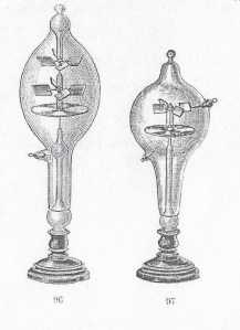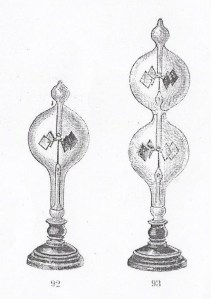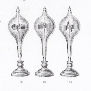Estos son modelos fabricados por Mónico Sánchez que fueron los primitrivos tubos de Crookes, sin la cruz de Malta. Puede comprobarse la gran variedad de modelos Se fabricaron en vidrios fosforencentes de diversos colores, verde, rojo, azul, amarillo, urano. Con potasa cáustica para demostrar la influencia que el grado de enrarecimiento ejerce sobre la fosforescencia del vidrio.
