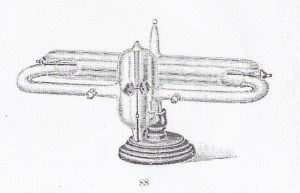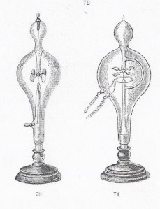 Demostracion muy grafica de un tubo de Crookes. Detras de la imagen un carrede de inducción de Rumkorf para la producción de corriente de alta frecuencia.