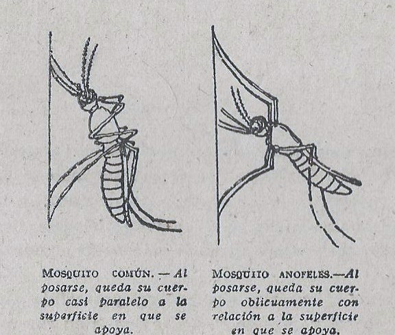 Grabado del folleto Instrucciones del Paludismo en España en el año 1943 mostrando el mosquito Anopheles que transmitia el paludismo