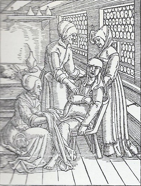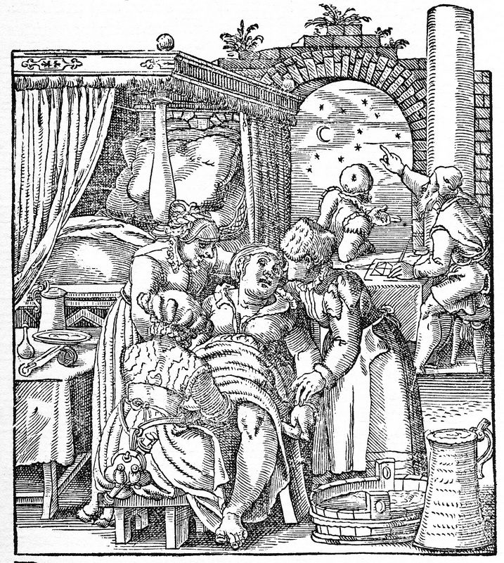 Rosslin en su obra “Rosengarten” dibuja una mujer en una silla explorando las comadronas esperando un parto.
